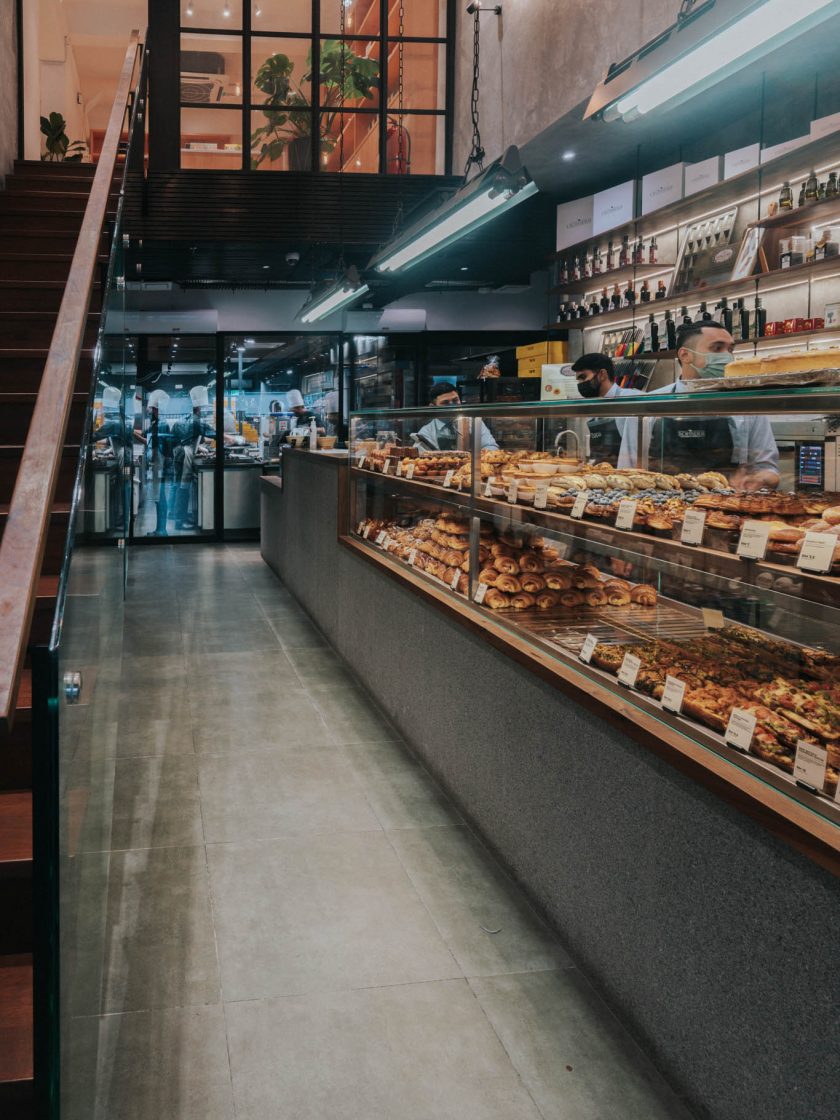This space has been designed as a continuous space, where the kitchen and service area are divided by a sliding glass door, with the wish to allow customers to watch the baker at work as they prepare every loaf, croissant and tart, added to the authenticity of the experience.