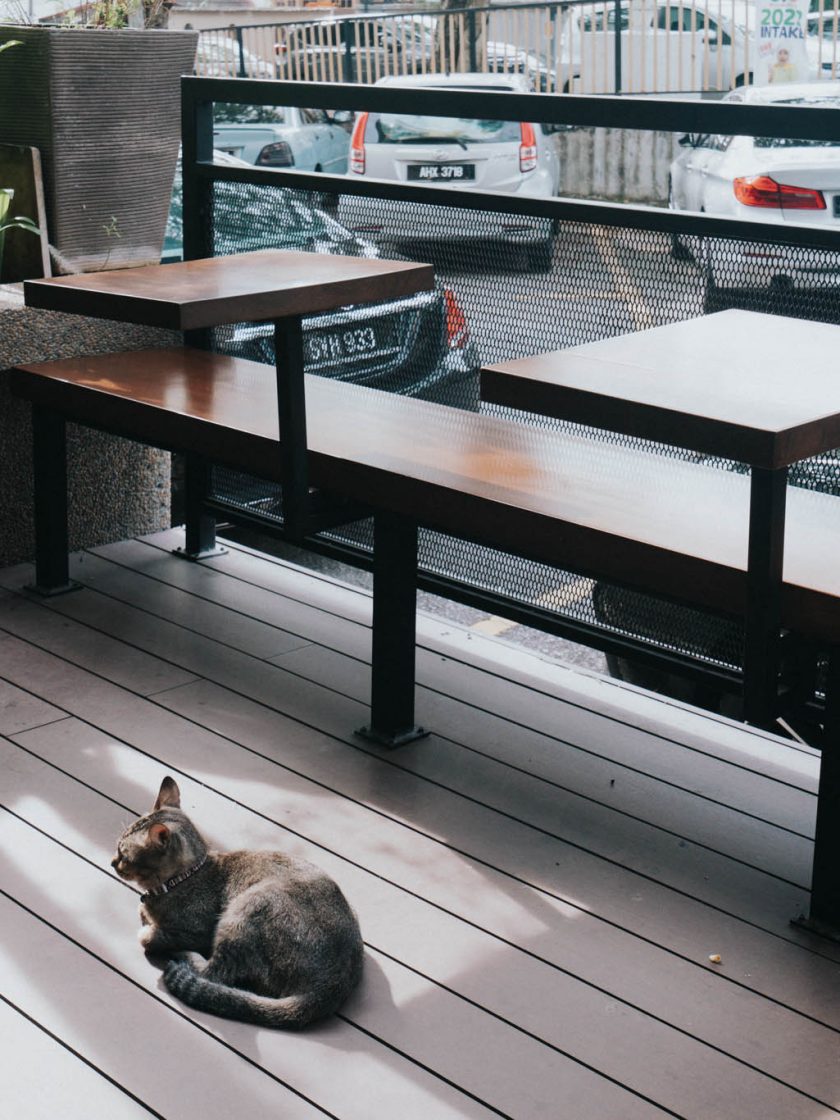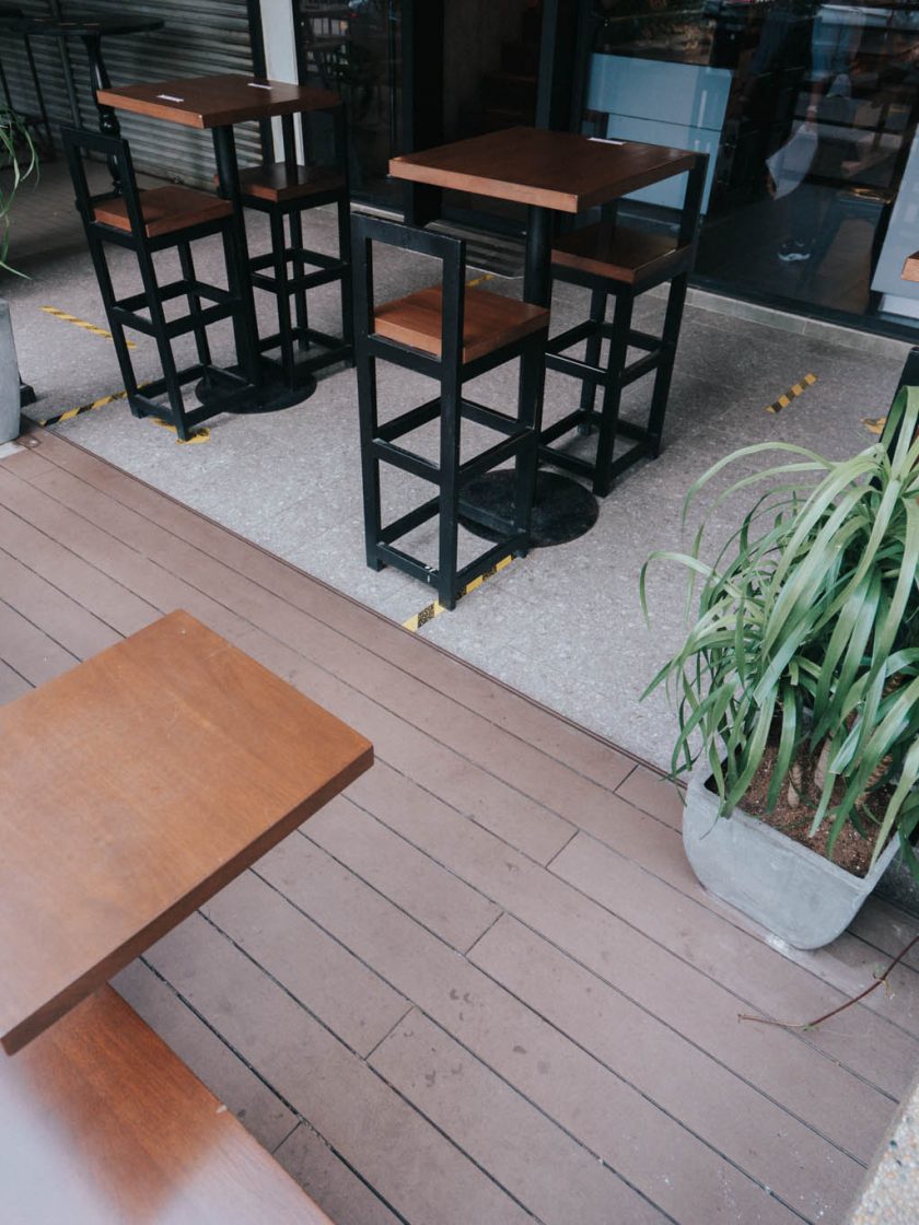 One cafe’s seating is positioned opposite the serving counter, and a few at the entrance.
