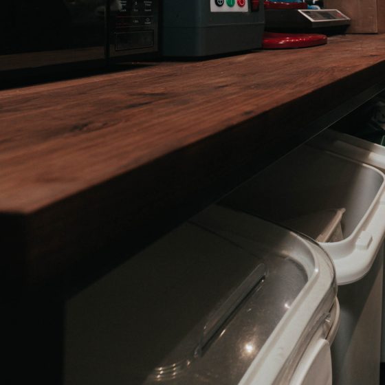 The kitchen is painted black— calm and chic. Black — has a personality that stands the test of time and gives this kitchen a very on-trend feel. Combined with wood and steel, this kitchen is inviting!