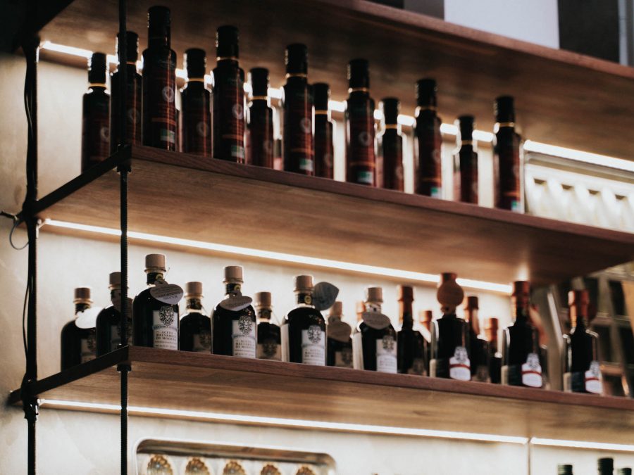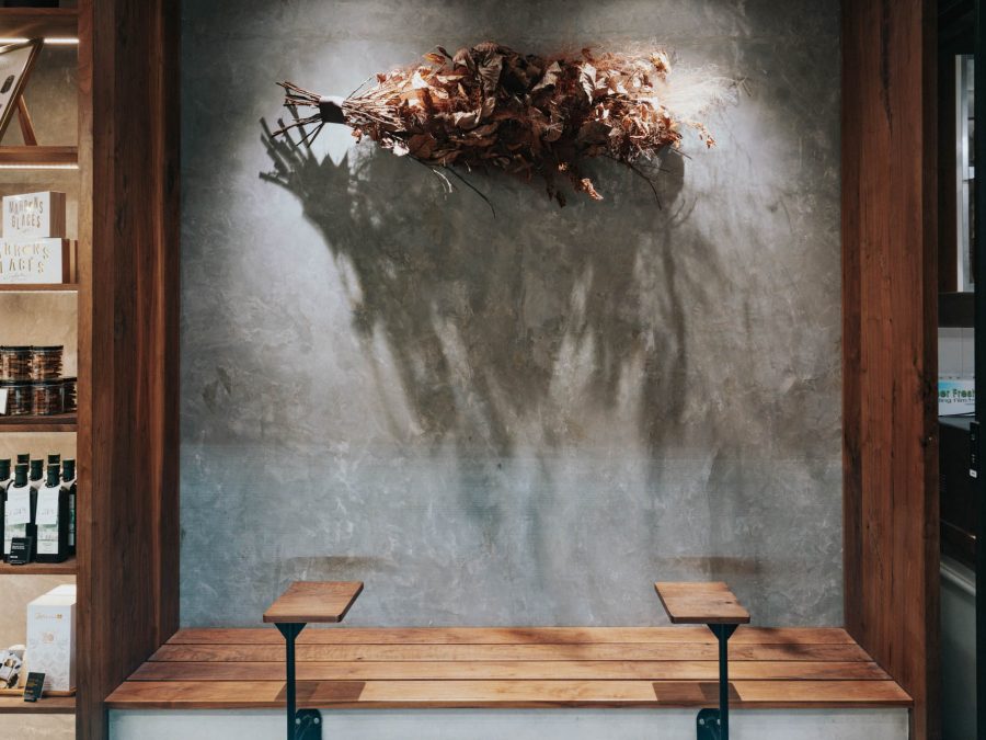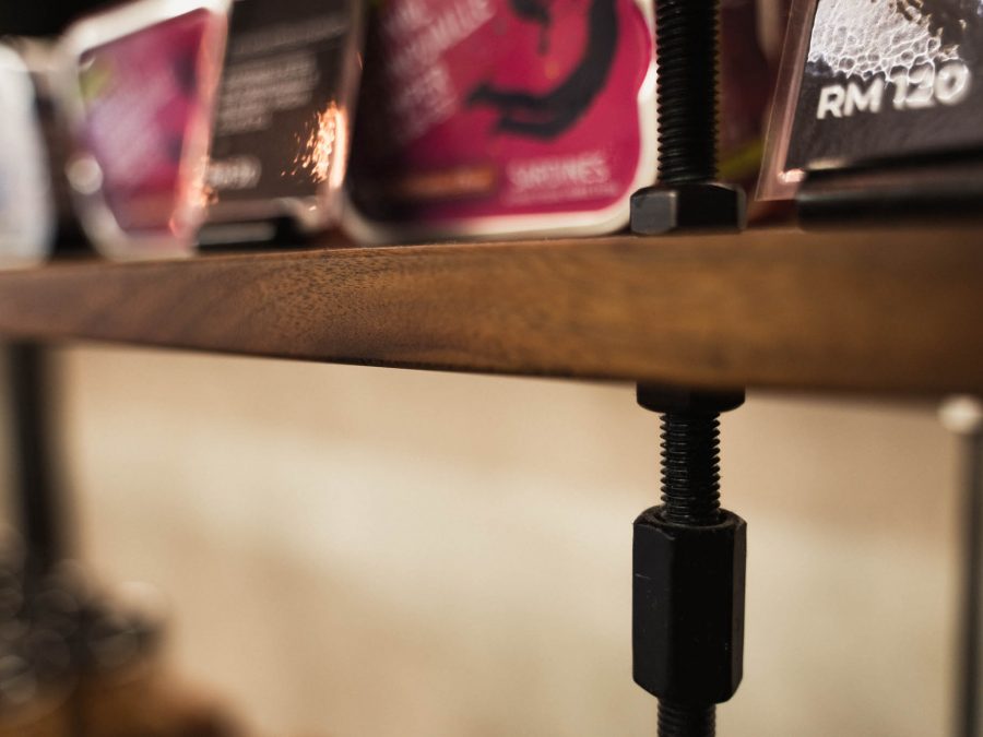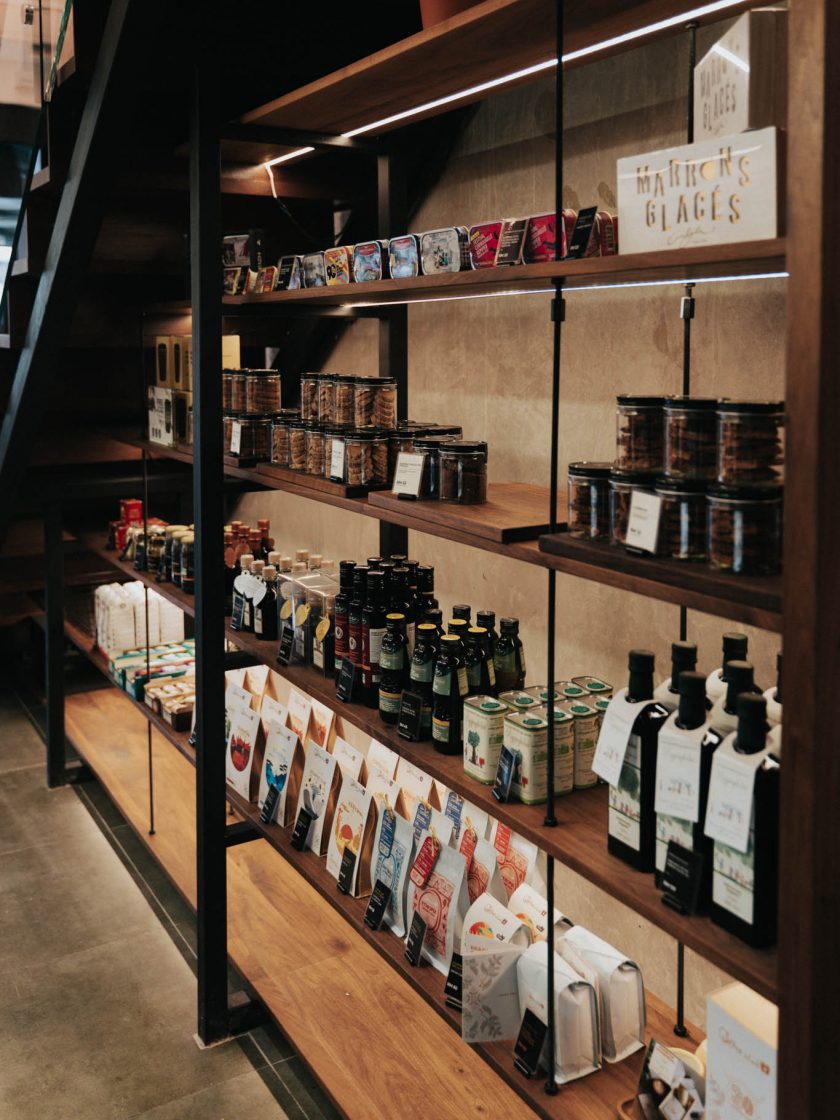 American walnut and black metal retail shelving add another visual layer and complete the ambience.