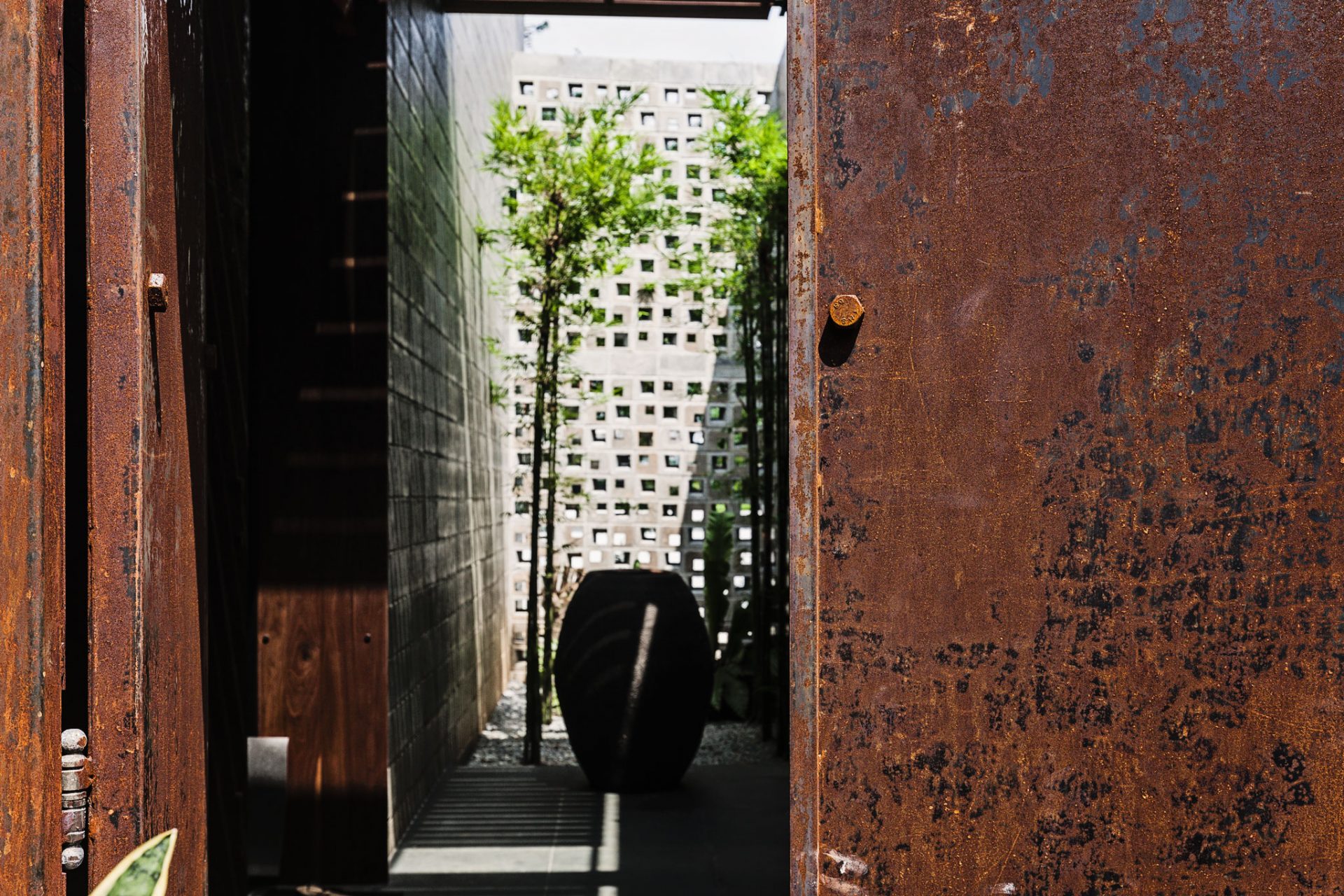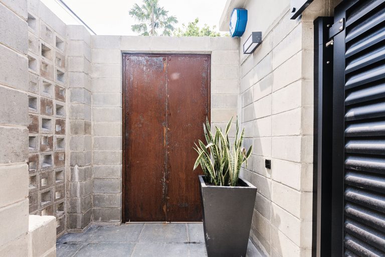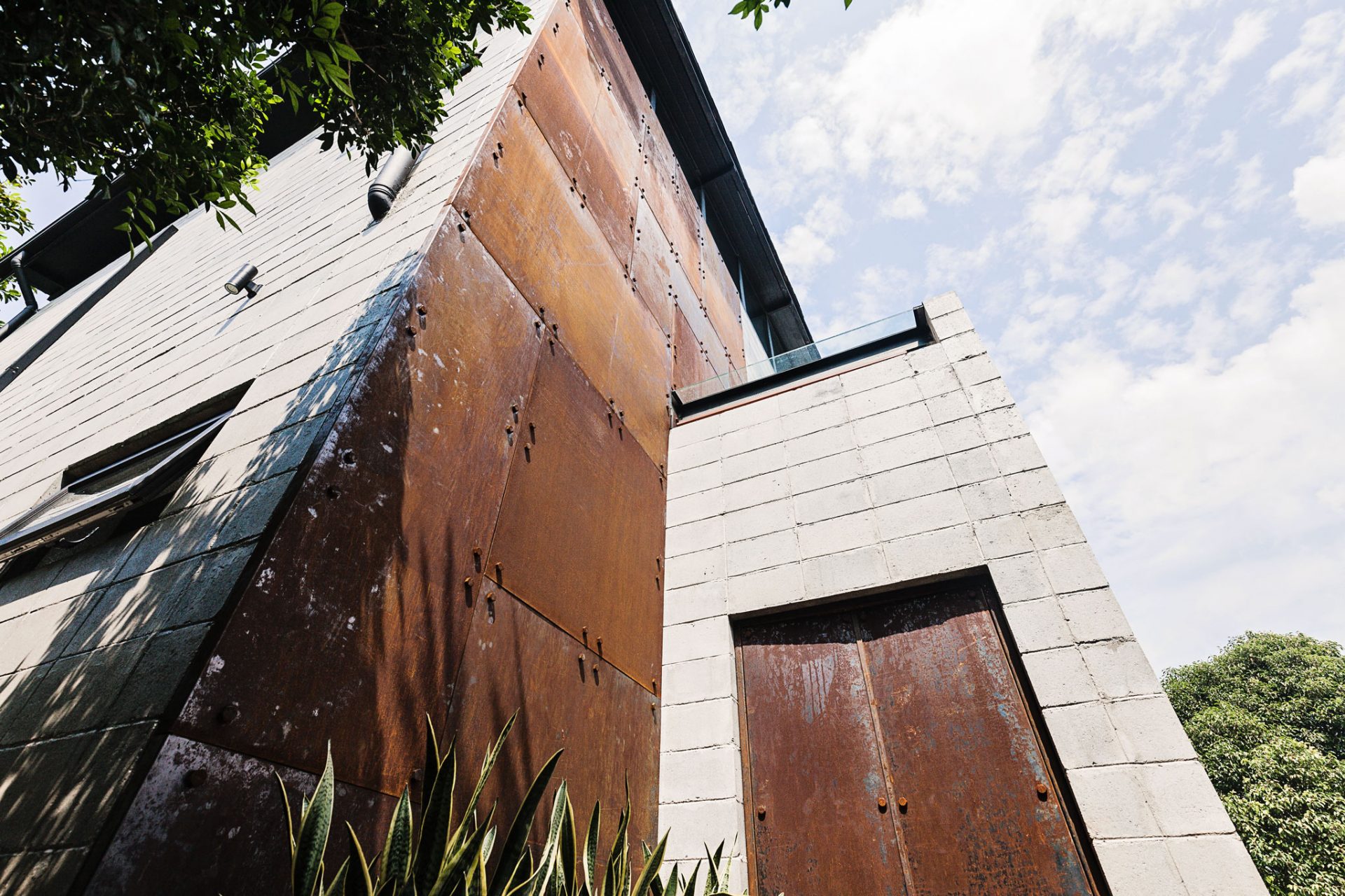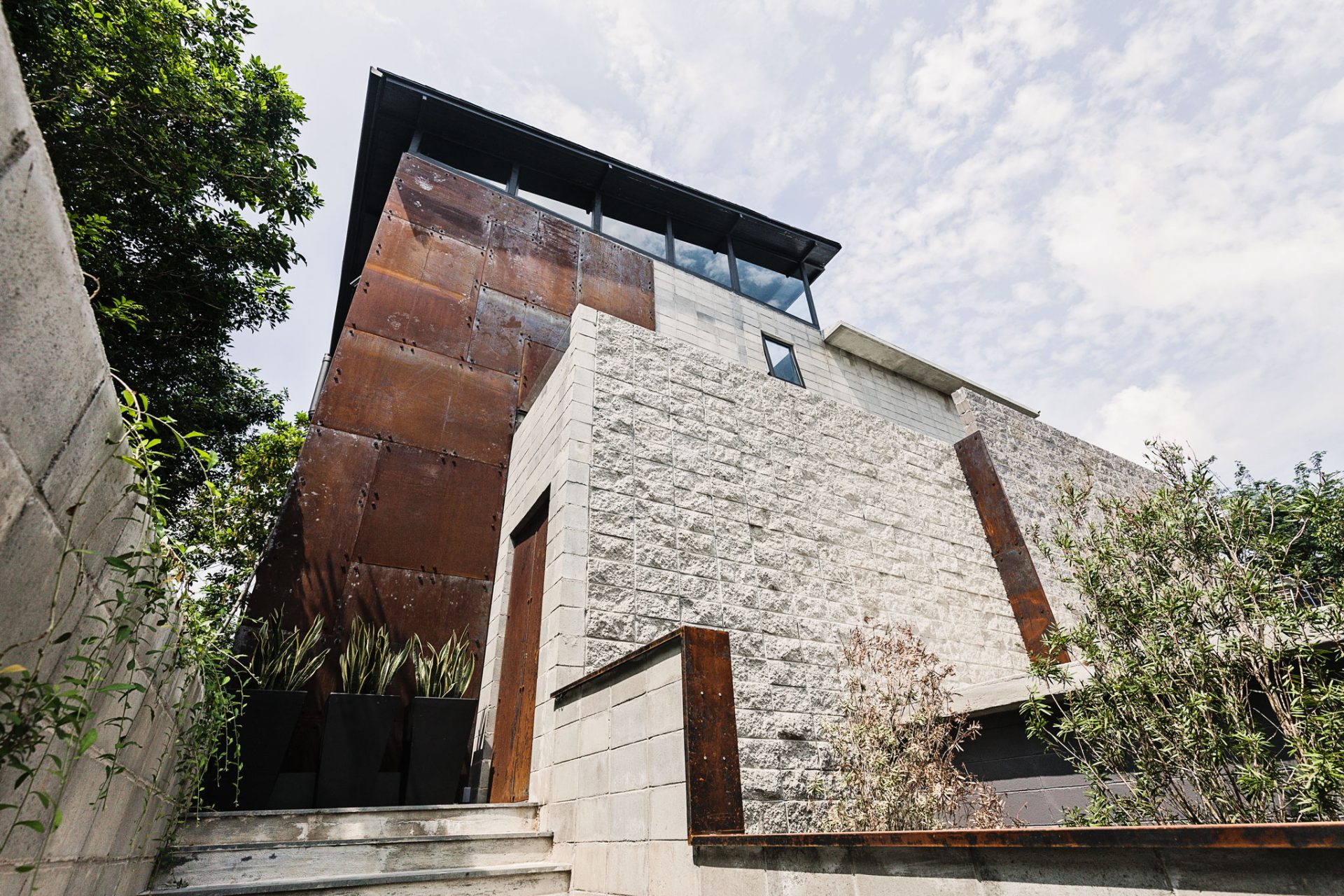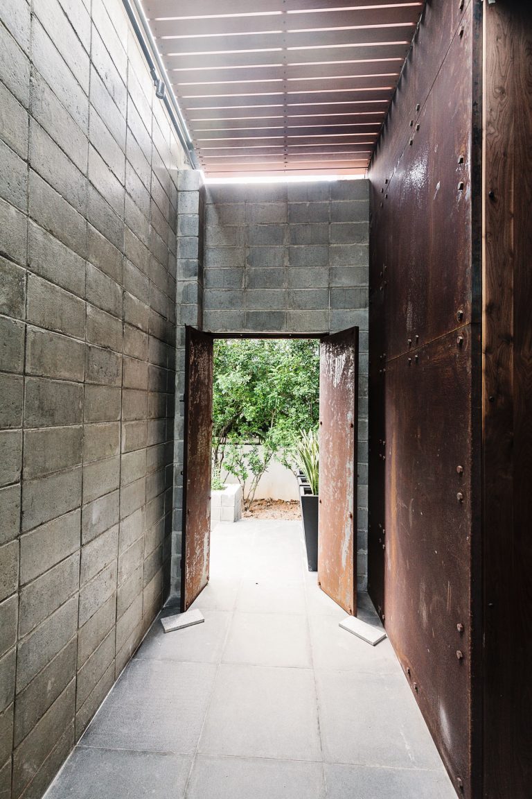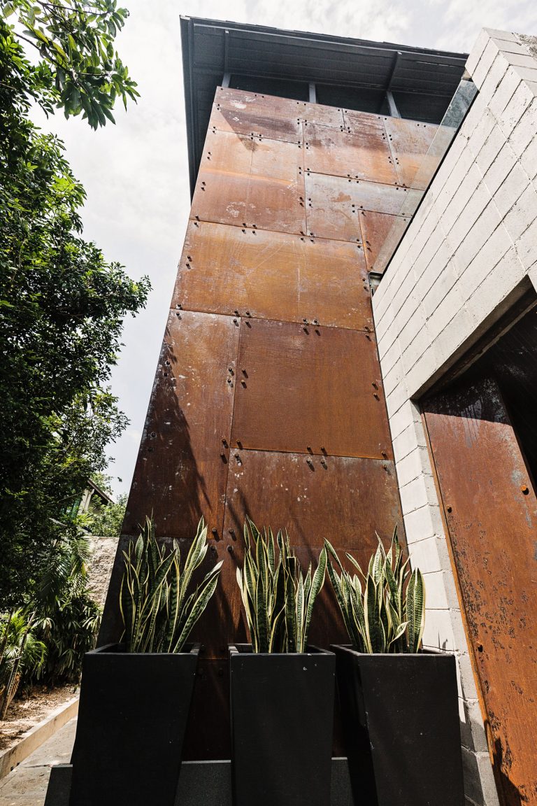 This earthy bungalow rocks with its mix of metal, stone, glass and wood design elements. Its hard to pinpoint just one eye-catching corner of this bungalow because it is layered with different styles, textures and materials throughout interior and exterior, evoking a very relax, warm and welcoming feel. But the most impressive of the design touches in this house is arguably the rustic metal wall panelling & doors, which were left out to rust and then sealed once there were the right amount of rust before installation.