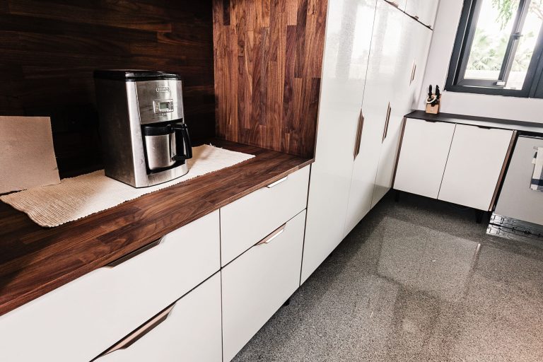 Cabinet: Premium acrylic, Stainless steel, Powder coated black steel frames, Kompacplus top, Clear glass sliding doors, BLUM accessories, Melamine colour carcass.